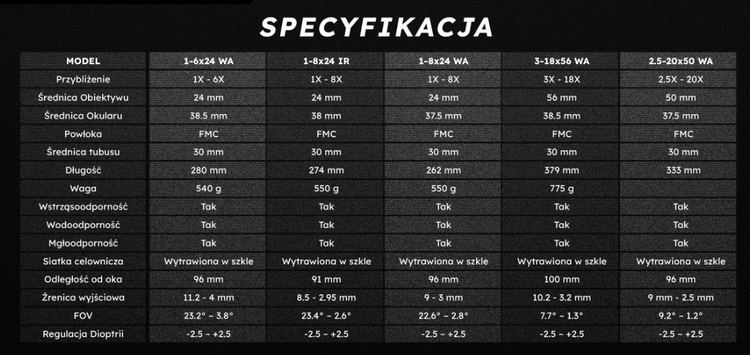 Precyzyjny krzyż celowniczy. Zastosowany krzyż nie zasłania celu, posiada delikatną kropeczkę podświetlenia pomiędzy belkami a przede wszystkim, dzięki specjalnym podziałkom, ułatwia nanoszenie korekt przy strzelaniu na dalszych dystansach.